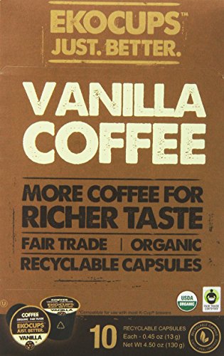-. Feature : Works with all Keurig K cup Brewers including the new Keurig 2.0 brewer / 100% ORGANIC and FAIR TRADE ARTISAN Vanilla COFFEE;Fair-trade, organic in recyclable capsules. / 13 grams of coffee packed into our EKOCUPS, 30%+ more coffee per cup than the average brand of single serve cups for a richer cup of coffee that just tastes better. / USDA Certified, Fair Trade and Organic Coffee. Gluten and Lactose free OU Kosher and Vegan; Using cool-peel-recycle technology, allowing our plastic cups to be recyclable by removing the lid and filter after brewing and recycling the cup. / Compatible with Keurig K-Cup brewers and other single serve brewers, not compatible with Keurig VUE. EKOCUPS has no affiliation with Keurig, Green Mountain or K-Cup; K-Cup is registered trademark of Keurig and/or Green Mountain