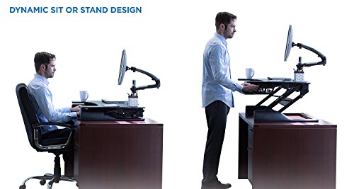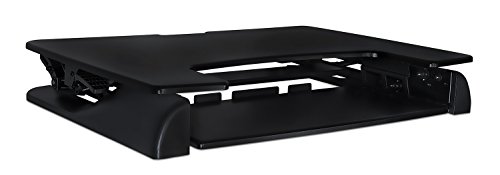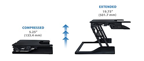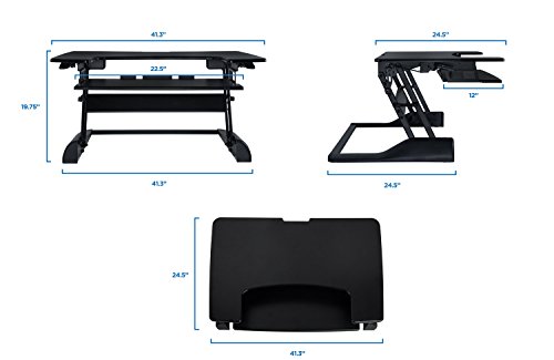 -. Feature : SIT TO STAND - Adjustable height standing desk workstation allows you to work sitting and standing throughout the day. Stepless height adjustment allows a comfortable standing or sitting position. Just squeeze the side handles and go from sitting to standing in seconds. / EASY and QUICK TRANSITION - Go from sitting to standing in one easy smooth motion. Spring lift mechanism assists with the lifting motion, even with your computer and monitor on it. The sit-stand desk goes from 5.25 inch high to 19.75" inch high. / SPACIOUS WORK AREA - The top surface measures 41" x 25" providing plenty of space for single monitor, dual monitor, and laptop + monitor setups. The secondary surface has enough space to fit a keyboard and a mouse. / ERGONOMIC KEYBOARD TRAY - Ergonomic keyboard tray keeps staggered height between keyboard and monitor to prevent neck strain without manual adjustments of sitting or standing. The tray is large enough to keep keyboard and mouse side by side and raises and lowers with the top surface. Weight capacity for the entire desk is 33 lbs / NO ASSEMBLY REQUIRED - Use your desk right out of the box! Place on your existing desk and start organizing your workstation