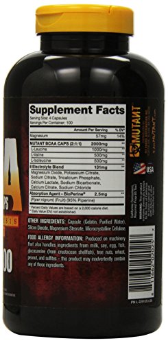 100 SERVINGS OF BCAAS | The Mutant BCAA 400 Capsule Supplement has 400 capsules, which means 100 servings, of a more convenient delivery method of getting your BCAAs. Keep a bottle in your gym bag and you'll never have to worry about missing a dose, mixing powder, or leaving them at home.