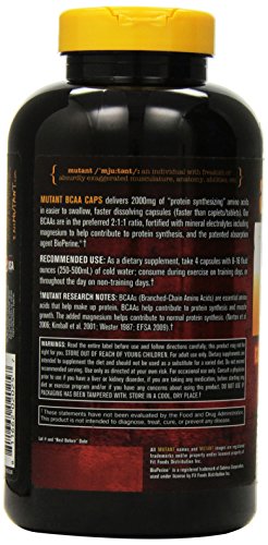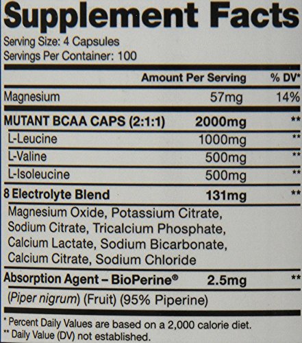 Mutant BCAA caps deliver 2000 mg of 100% free form BCAAs per dose in the preferred 2:1:1 ratio. Plus we've kept intact the vital mineral electrolytes and the patented absorption agent BioPerine that we also use in our Mutant BCAA 9.7 powder.