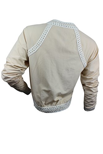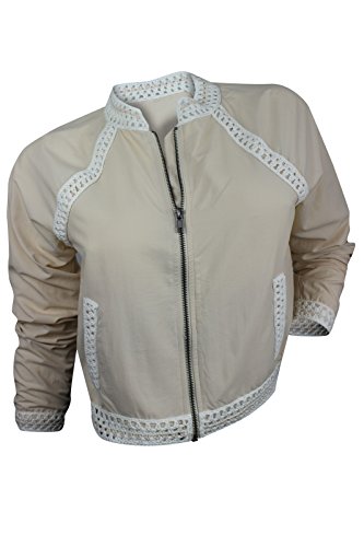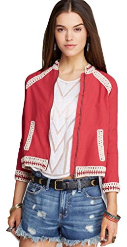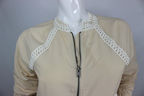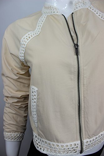 Long sleeves, stand collard, front zipper closure, two front off-seam slash pockets, crochet trim throughout, fitted, lining.