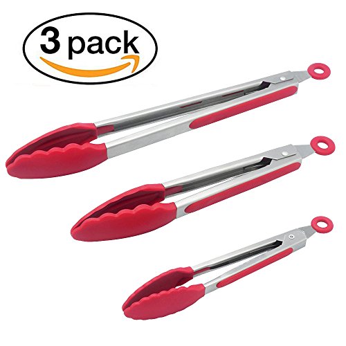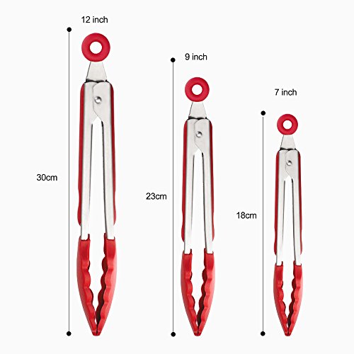 Portin Premium Stainless Steel Silicone Kitchen Tongs, Set of 3 - 7, 9, 12 Inch Heavy Duty , Non-stick Turner for Barbecue, Salad ,Cooking, Grilling- A Serving and Feeding Set for Your Kitchen (RED)