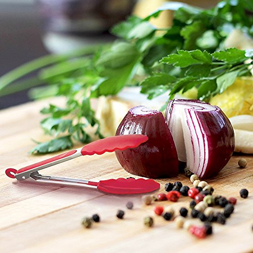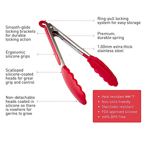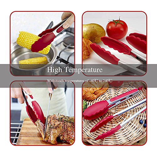 - HIGH TEMPERATURE RESISTANCE AND DISHWASHER SAFE: Heat Resistant and Non-Removable Silicone Tips - Superior Quality Silicone cooking Tongs are completely heat resistant to 446ºF, giving you peace of mind that the silicone will not melt and contaminate the food. Also, you can wash these tongs with soapy water or put it into dishwasher.