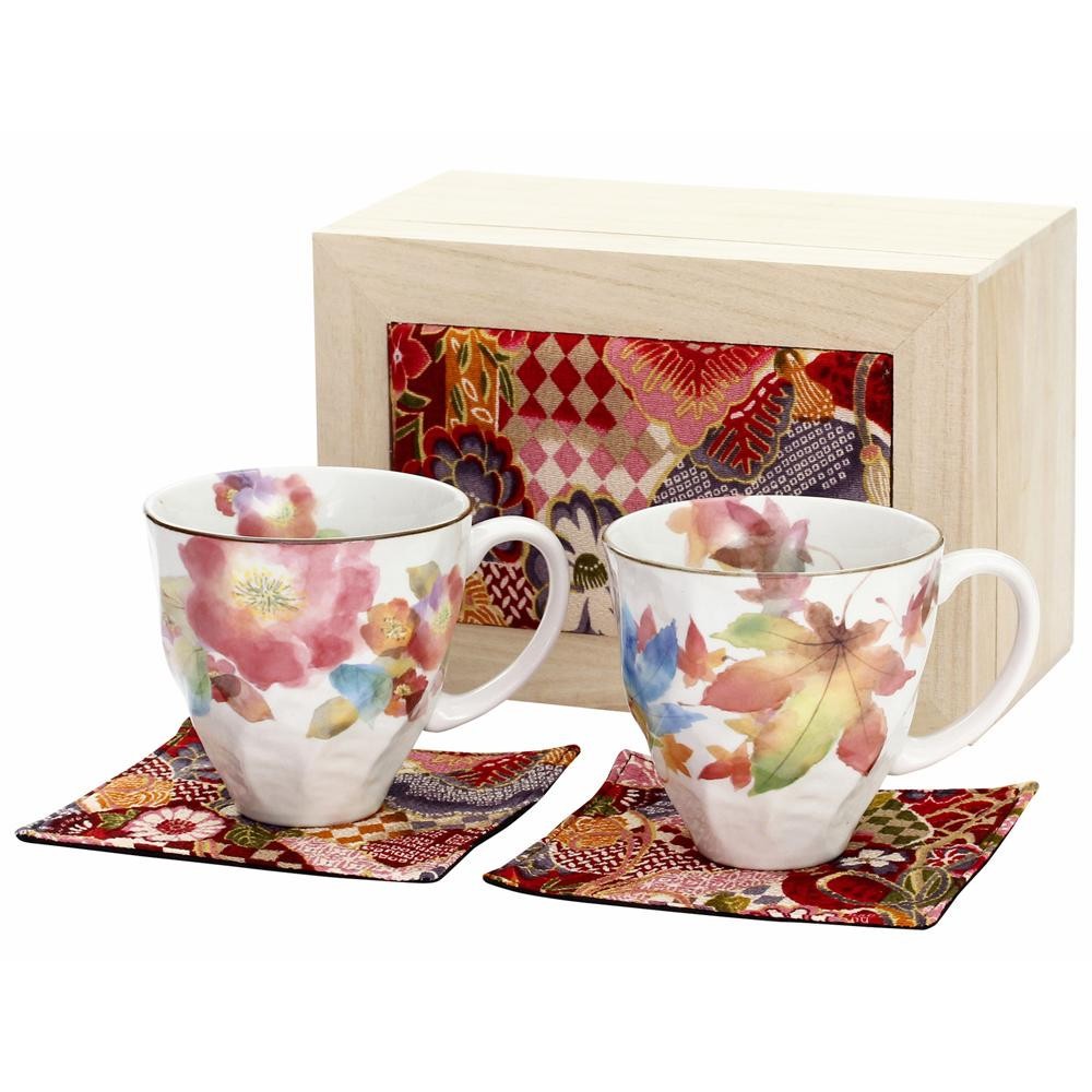 山茶花、紅葉が色とりどりに描かれたマグカップのコースター付きペアセットです。大切な方へのギフトとしても最適です。 |