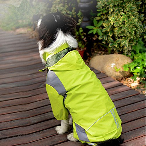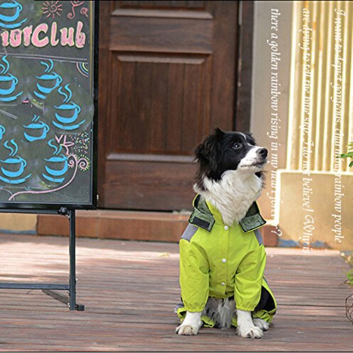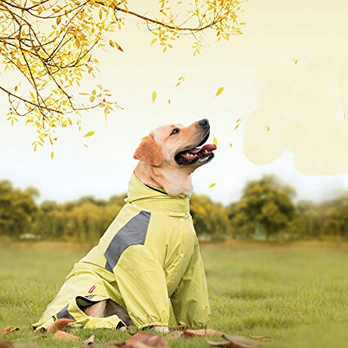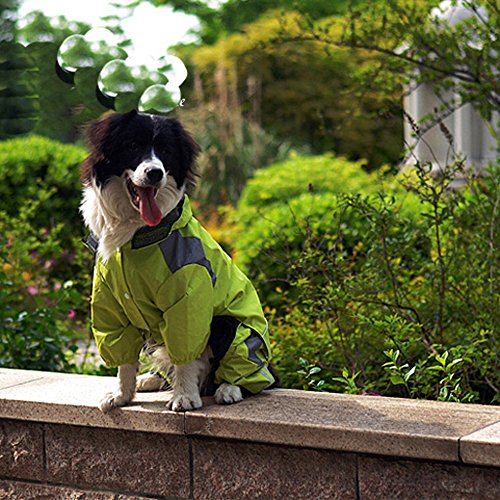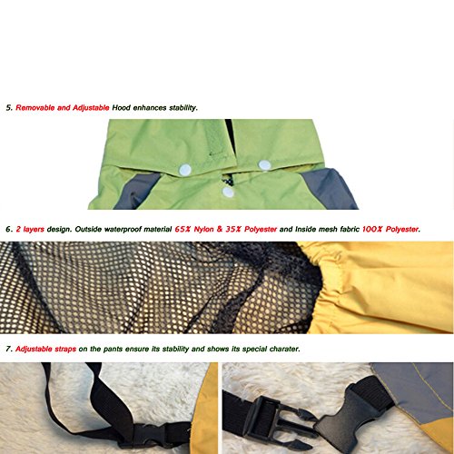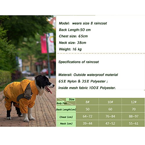 - Feature : Sizes fit different Medium and large dogs (Please choose the size carefully before purchasing). Size 8: Neck 15"-17", Chest 25"-28", Back length 20"; Size 10: Neck 18"-20", Chest 30"-33", Back length 24"; Size 12: Neck 21.5"-24", Chest 34.5"-38", Back length 27". / Weight of coat Size 12: 0.6 KG (Weight differs due to different sizes.) / Dog model of the photo: Weighs 16 KG and wears size 8 coats. / Package included: 1 x Jacket, 1 x Pants, and 1 x convenient Carrying Pouch. / Material: This raincoat is 2 layers design. Outside waterproof material 65% Nylon & 35% Polyester and Inside mesh fabric 100% Polyester. Using professional outdoor clothing material, it combines high waterproof, high breathable and high durable characteristics. Removable and Adjustable Hood enhances stability. Adjustable belly strap ensures a secure and comfortable fit. Adjustable straps on the pants ensure its stability and also shows its special charater. Color stitching design highlights its stereoscopic sensation. Waterproof rain jacket keeps pets dry and comfortable in the rain.