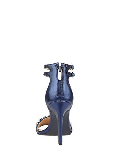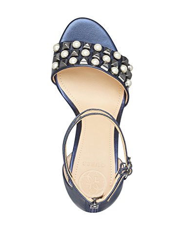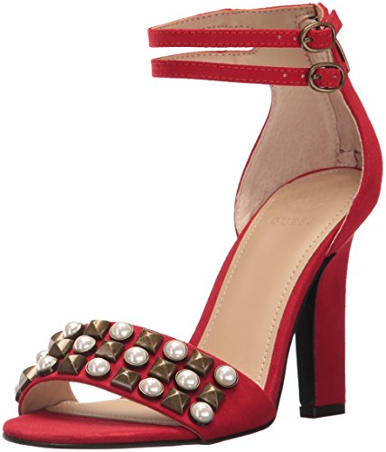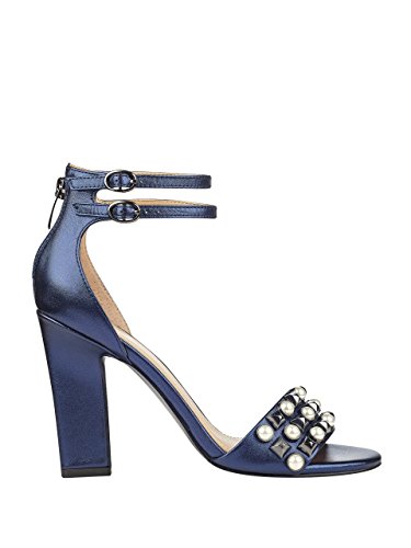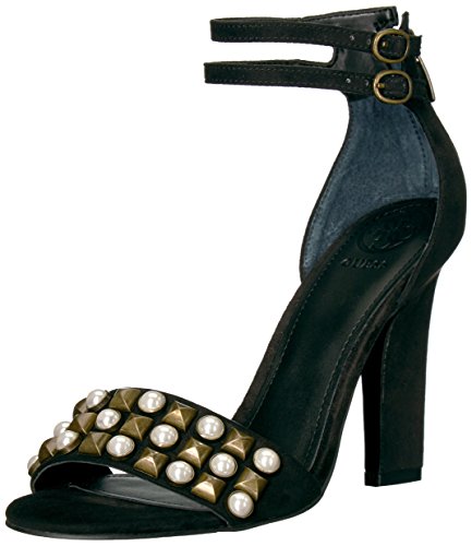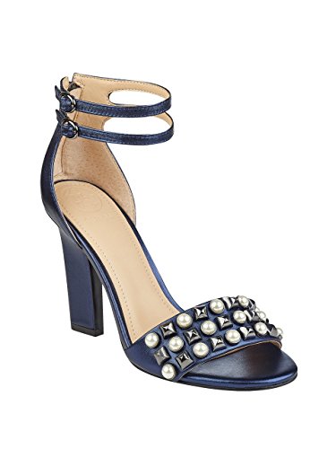Stud and pearl details trim these faux-suede sandals, designed with two ankle straps and a back zipper closure.