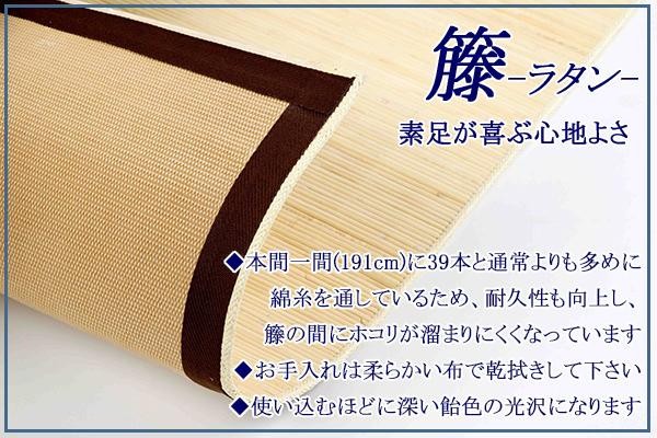 天然セガ籐を使用した玄関マットです。通常より多めの綿糸を通すことで、目詰まり良く締め込みました。また、両端は籐の細表皮を手篝仕上げした丹念な作りになっています。裏面は滑りにくい加工を施しています。 |