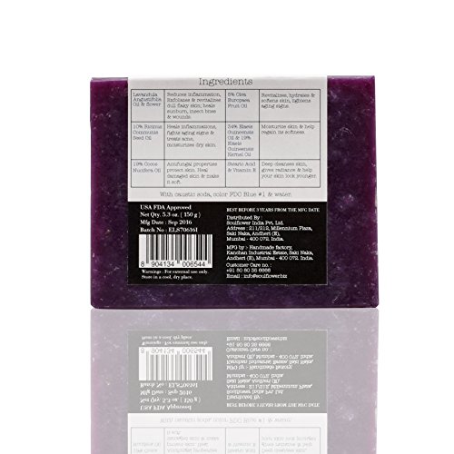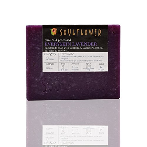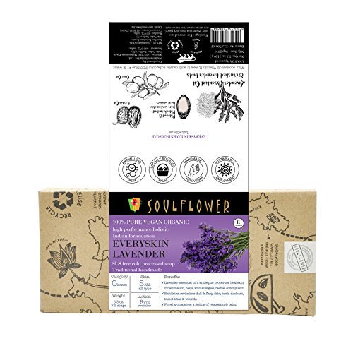 -. Feature : This soap is US FDA approved, SLS free and doesn't contain Parabens, Sulphates and Phthalates. / 100% PURE, VEGAN, ORGANIC, HANDMADE COLD PROCESSED INDIAN FORMULATION: Soulflower Everyskin Lavender Soap is a pure vegan traditional Indian formulation with lavender flower and lavender oil, olive oil, castor oil and coconut oil. / EXFOLIATE, REVITALIZE AND RESTORE DAMAGED SKIN: Vitamin E, essential fatty acids and nutrients rich Soulflower Everyskin Lavender Soap works in giving you a sharp, tight skin tone, exfoliate and revitalize, stimulate cell growth, balance skin oil and controls acne and pimples. / WHY SHOULD YOU USE SOULFLOWER COLD PROCESSED SOAP: This 100% vegan soap is made from natural herbs, essential oils and vegetable oils. Glycerine is a natural byproduct and has humectants properties, attracting moisture to your skin making it softer and smoother, one of the reasons that our soaps are so beautiful on the skin. This soap does not use any animal products like milk and honey. Soulflower soaps are SLS free and don't contain Parabens, Sulfates or Phthalates. / PERFECT FOR: This soap is perfect for all types of skin. Real Herbs in soap bar might discolor making the product look different when the customer receives it. The package is double sealed to avoid spillage and to ensure that the product reaches you safely.