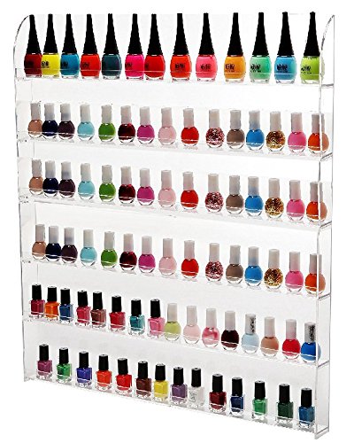 6 Layers hold up to 102 bottles of nail polish (actual number may vary based on size and shape of bottles). Clear acrylic railing to prevent the bottles from falling.
