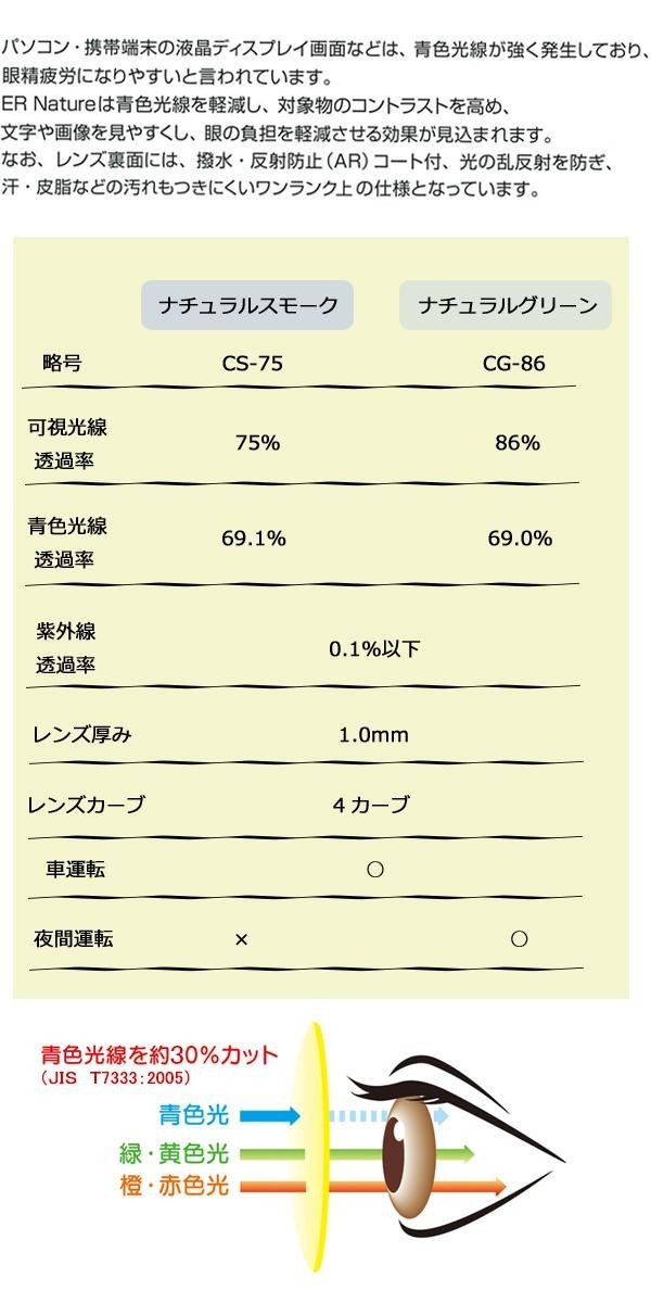 | パソコン・携帯端末の液晶ディスプレイ画面などは、青色光線が強く発生しており、眼精疲労になりやすいと言われています。ER Natureは青色光線を軽減し、対象物のコントラストを高め、文字や画像を見やすくし、眼の負担を軽減させる効果が見込まれます。 |