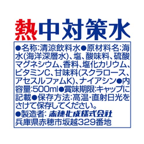 原材料:塩、L-カルニチンL-酒石酸塩、海水(海洋深層水)ミネラル/酸味料、硫酸マグネシウム、香料、塩化カリウム、甘味料(スクラロース、アセスルファムK)、ナイアシン