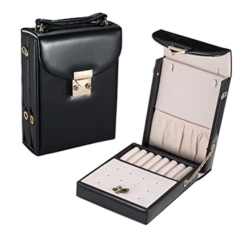 -. Feature : Material: in a PU leather effect with a soft padded top, Compact but very useful and well thought out design. / It's 7.3 x 5.1 x 2.2 inches (18.5x13x5.5 cm) so easy to slip into your suitcase or bag. / It fits 6 stud earring pairs, several pillows in the middle for rings and on the other side for necklaces or watches. And there is a secret compartment under the earring holder. / The case with clasp closure, comes with a removable strap, you can use it as a shoulder bag for wallets and phone. / It is a great idea to keep everything organized and the perfect size for travel shopping, and a great Christmas gift for girls.