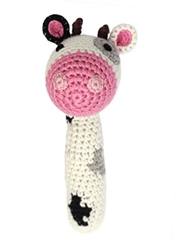 Moo... This sweet little cow is looking for a new friend. This easy to grasp stick rattle is lovingly hand-crocheted using soft 100% organically grown and sustainably harvested bamboo. Bamboo yarn is soft, naturally antibacterial and non-allergenic - perfect for babies. Designed in San Francisco, USA but lovingly hand-crocheted by a team of artisan women in China, mostly mothers and farmers working to provide their families with extra income for basic needs. Non-toxic and tested at the highest standards for safety. Size: 6.5" tall Washing instruction: Washable in gentle cycle and tumble dry low.