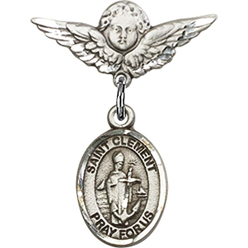 -. Title : Sterling Silver Baby Badge with St. Clement Charm and Angel w/Wings Badge Pin 7/8 X 3/4 inches