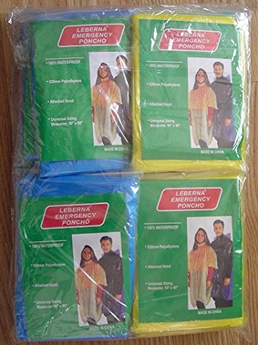 Currently 2 Different colors in this pack. 10 Blue and 10 Yellow. Each poncho was packed in a zip bag with original Leberna TM card.