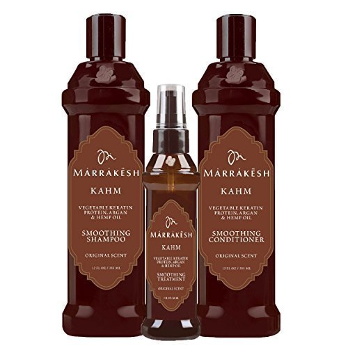 Our Kahm smoothing collection is a 3 step system that utilizes Vegetable Keratin Protein to help you achieve perfectly smooth hair. This system includes Kahm Smoothing Shampoo and Smoothing Conditioner, which cleanses and moisturizes unruly hair while also helping to tame frizz, and Kahm Smoothing Treatment, which contains a blend of Vegetable Keratin Protein, Argan Oil, and Hemp Seed Oil significantly improves internal strength and locks in smoothness without damaging chemicals. This collection can be used on all hair types, whether you want stick straight hair or silky smooth curls.Feature