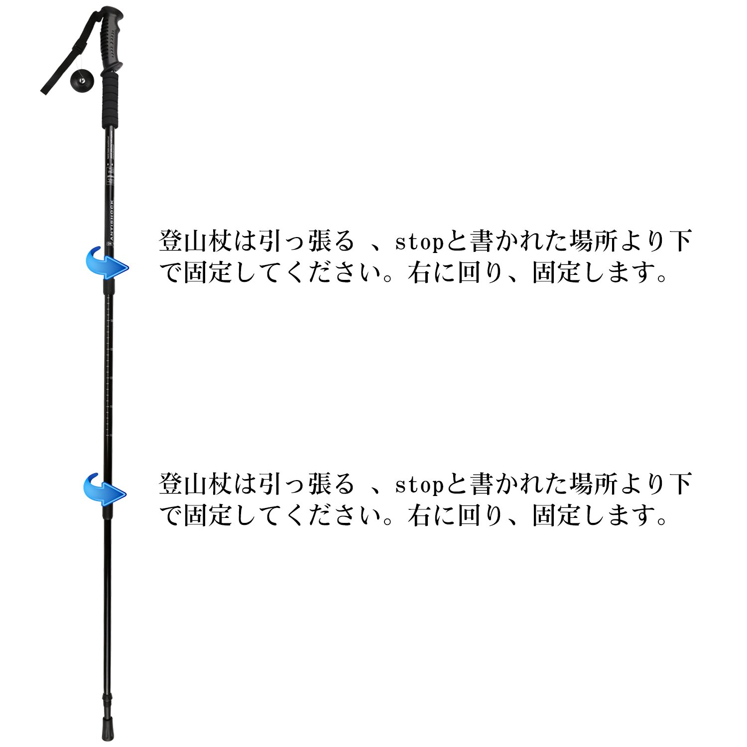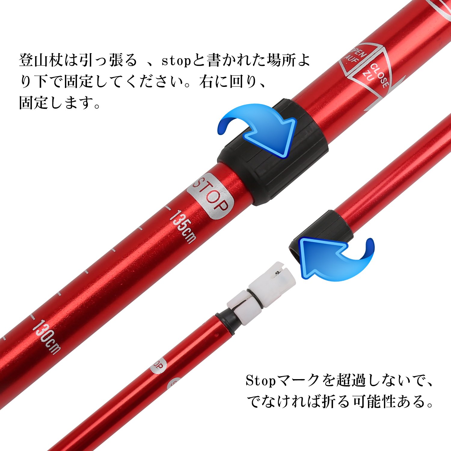 When using, please extend to the place written "STOP" of trekking pole, if you extend more than "STOP", stock will cause stable failure, please be sure.
