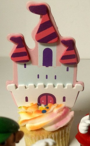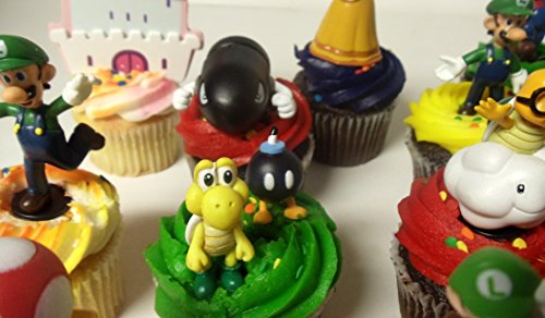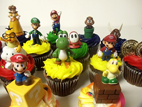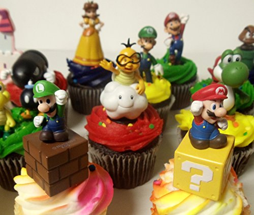 SUPER MARIO BROTHERS 18 PIECE DELUXE BIRTHDAY CUPCAKE TOPPER SET FEATURING SHY, MARIO, GOOMBA, YOSHI, BOMB, LUIGI, KOOPA TROOPA, MUSHROOM, PRINCESS DAISY, LAKITU SPINY AND THEMED DECORATIVE ACCESSORIES - CUPCAKE TOPPERS RANGE FROM 1" TO 4" TALL BY NINTENDO
