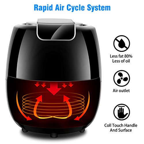 FEATURING DYNAMIC AIR FLOW TECHNOLOGY -- No oil smell, no splatter, no mess. The unique and patented design circulates hot air around the entire unit, ensuring all food is cooked evenly. This air fryer produces food that has up to 80% less fat than oil-fried foods, without sacrificing the taste.