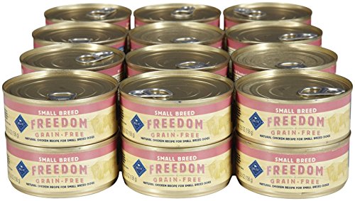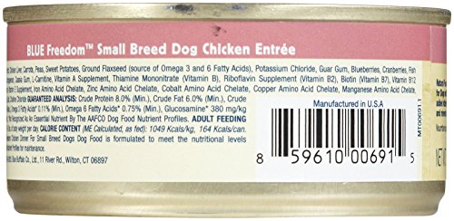 -. Binding : Misc. -. Brand : Blue Buffalo -. EAN : 0859610006922 -. Feature : 5.5 oz can (pack of 24) / Made in the USA / Blue freedom contains no grains, so it has no glutens. Glutens are known to trigger allergic reactions in some dogs -. Label : Blue Buffalo -. Manufacturer : Blue Buffalo -. Model : 596472 -. MPN : FBA_BUA-239 -. NumberOfItems : 1 -. PackageQuantity : 1 -. PartNumber : FBA_BUA-239 -. ProductGroup : Pet Products -. ProductTypeName : PET_SUPPLIES -. Publisher : Blue Buffalo -. Size : 7 lb -. Studio : Blue Buffalo -. Title : Blue Buffalo 596472 12.5 oz Freedom Adult Small Breed Grain-Free Chicken Wet Dog Food (24 Pack), 7 lb -. UPC : 859610006922