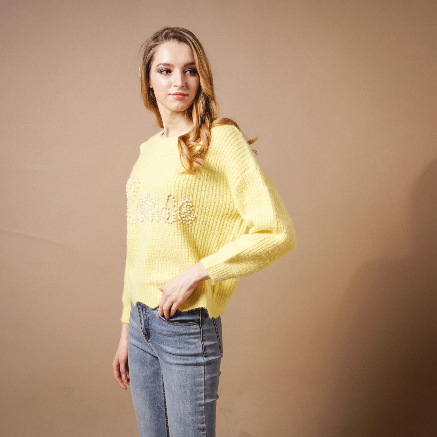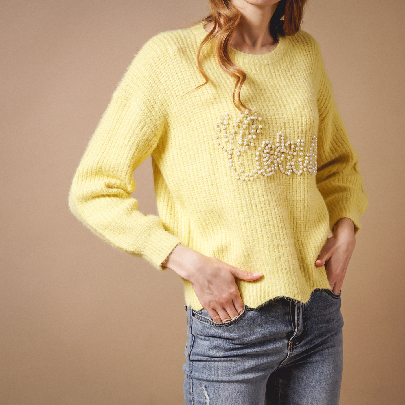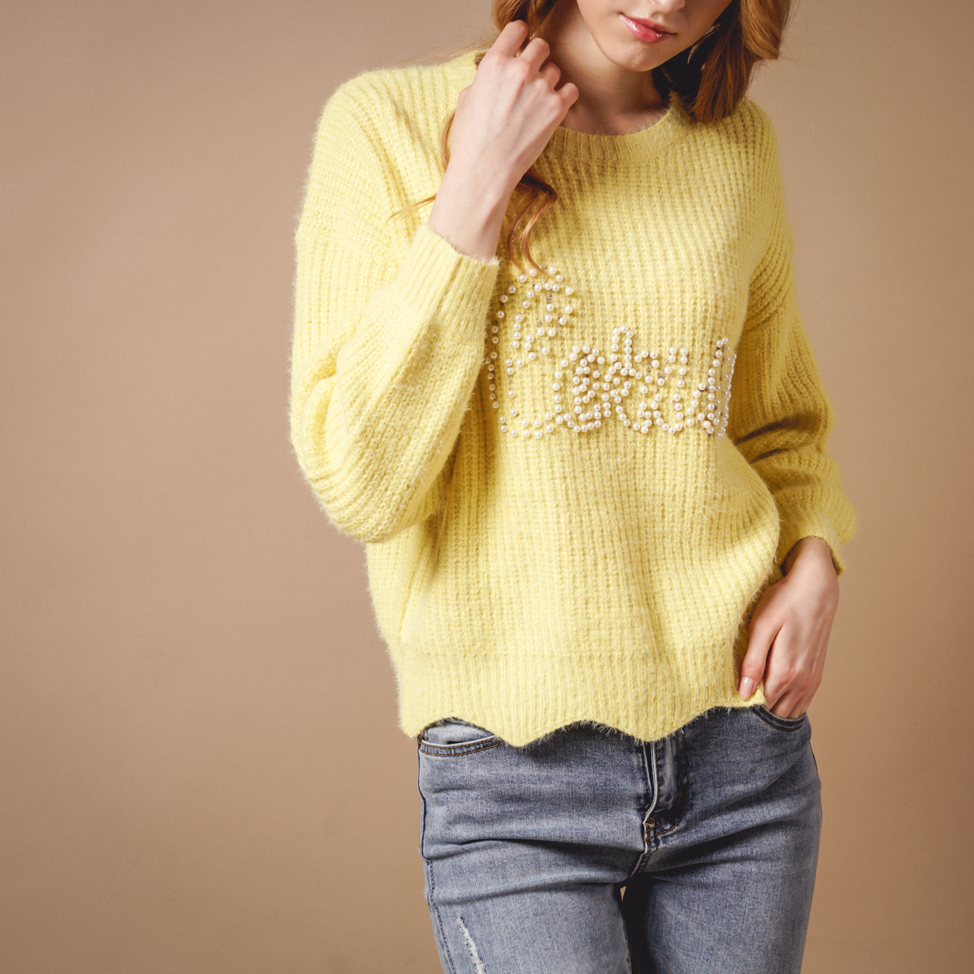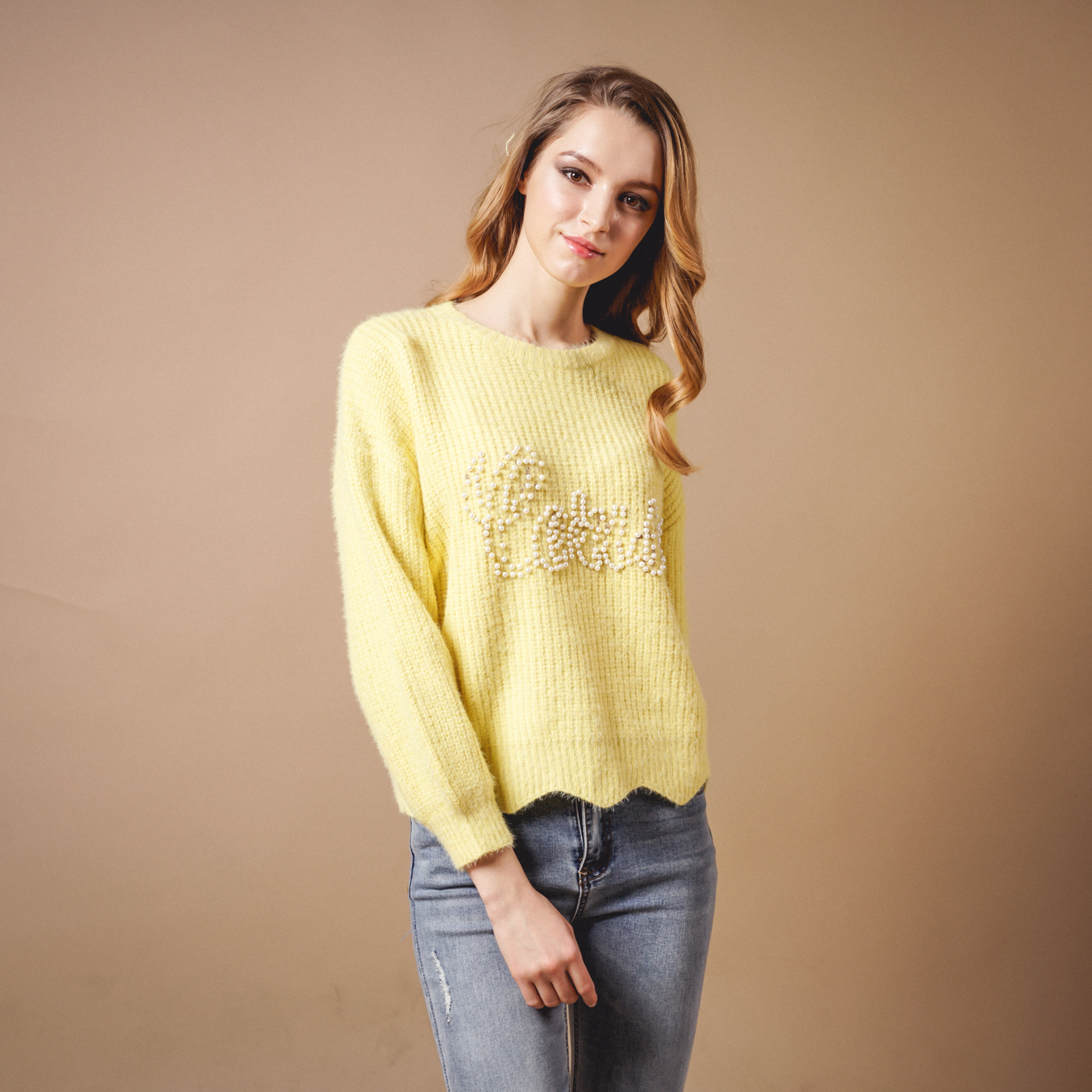 진주포인트가 돋보이는 사랑스런 컬러의 물결라인 니트 탑입니다.