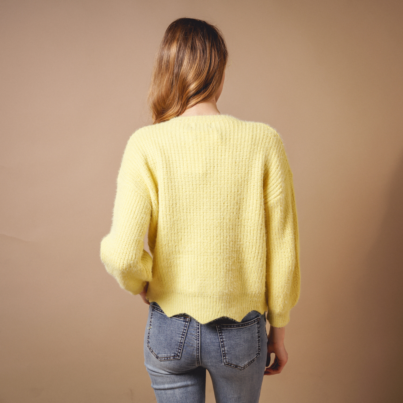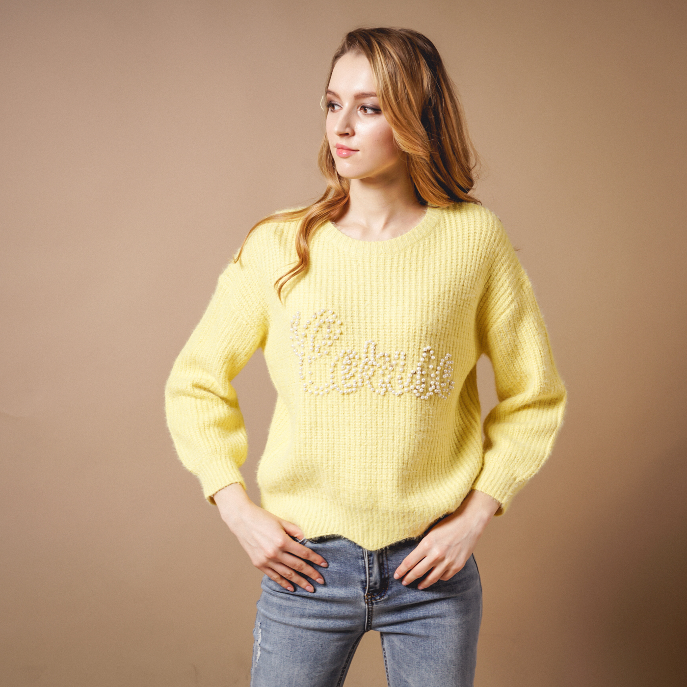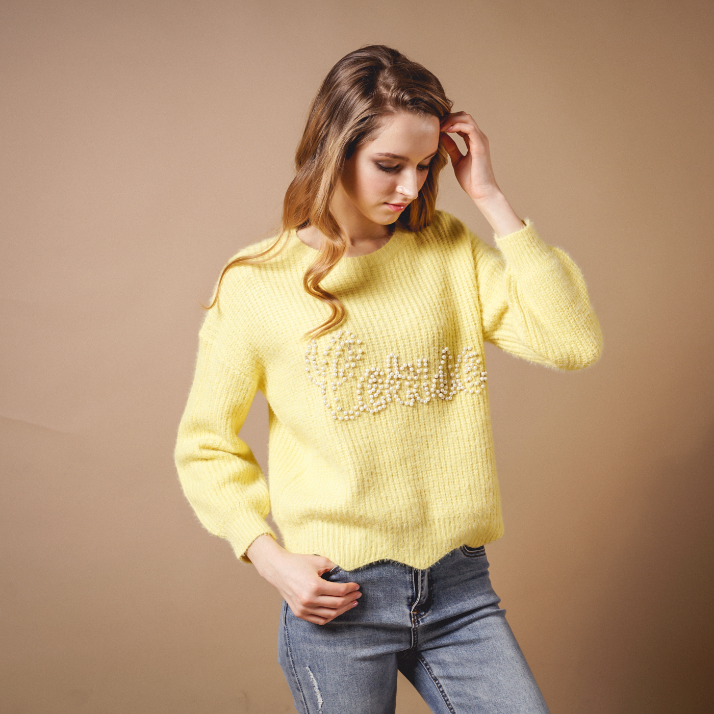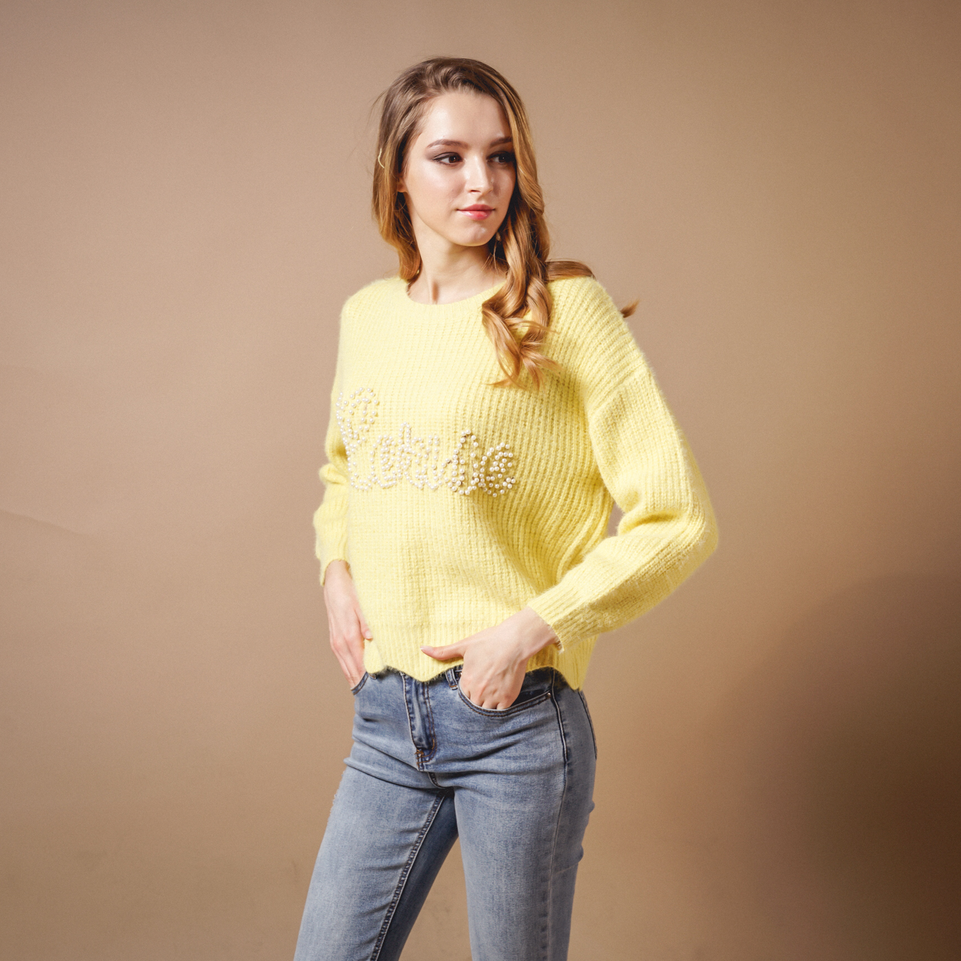 진주포인트가 돋보이는 사랑스런 컬러의 물결라인 니트 탑입니다.