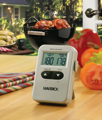 Studio : Maverick Housewares Publisher : Maverick Housewares Binding : Kitchen Product Description The RediChek Remote Cooking Thermometer takes all the guesswork out of knowing when your meats on the grill or in the oven are done and cooked to perfection. This thermometer features a stainless steel probe to take accurate readings in the oven or the grill. Monitor food doneness up to 100-feet away; temperature is displayed on the receiver for convenience. Program the thermometer to the desired temperature, and RediChek will alert you by beeping when the desired temperature has been reached. Requires four AAA batteries (included). 0