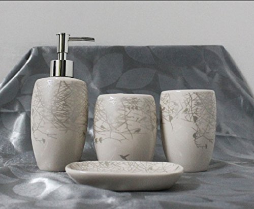 -. Feature : Four-pieces: Latex Bottle, Tooth Mug, Toothbrush Rack, Soap Box / Stylize your bathroom with modern silhouette bird and branch graphics with this 4-piece ceramic set of bathroom accessories. / Made of quality, durable and easy-to-clean ceramic / Durable, very easy to clean, practical for everyday use / Bathroom decor set for your home to make your home look more goodlooking
