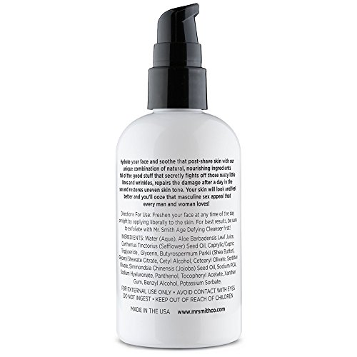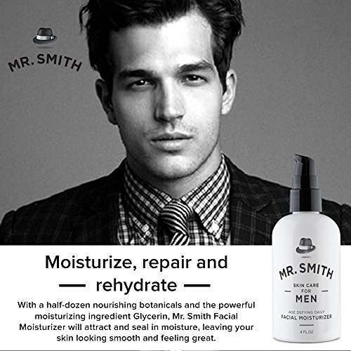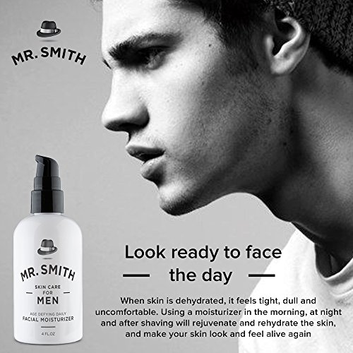 -. Binding : Misc. -. Brand : Mr. Smith -. EAN : 0646437272834 -. Feature : 1. THE RIGHT FUEL FOR YOUR FACE - Our uniquely designed formula is rich with natural vitamins, minerals and nutrients that are essential to your skin. / 2. SUITABLE FOR ALL SKIN TYPES - Whether your skin is normal, dry, combination, acne-prone, rough, oily, or sensitive, and whether you are young or old, Mr. Smith Age Defying Daily Facial Moisturizer will be the best choice you make. / 3. WHY SHOULD YOU USE IT? - Mr. Smith Co.'s Age Defying Daily Facial Moisturizer is your secret weapon against those sneaky age issues like fine lines & wrinkles, uneven skin tones, sun damage and irritation caused by shaving. / 4. WHAT'S THE SECRET? - Well, we can't give EVERYTHING away, but we can tell you this - our unique combination of natural plant-based ingredients will leave your skin refreshed, rejuvenated and visibly renewed. / 5. 100% MONEY BACK SATISFACTION GUARANTEE - Don't love your Mr. Smith Age Defying Daily Facial Moisturizer? We will happily REFUND you in full. That's our promise to you! -. MPN : 4092031 -. PackageQuantity : 1 -. PartNumber : 4092031 -. ProductGroup : Beauty -. ProductTypeName : BEAUTY -. Size : 4 Ounces -. Title : Mr. Smith Daily Facial Moisturizer for Men 4oz. Anti-aging Face Care Cream and Soothing Aftershave Lotion All in One. All Natural. Suitable for All Skin Types -. UPC : 646437272834