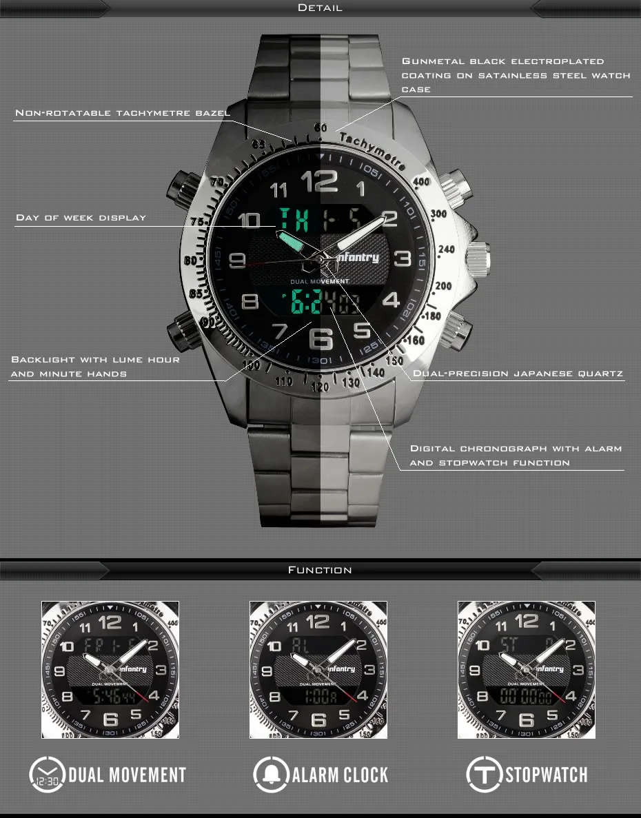 Feature:Luminous Hands,Stop Watch,LED display,Auto Date,Week Display,Water Resistant,Back Light,Chronograph,Multiple Time Zone,Alarm