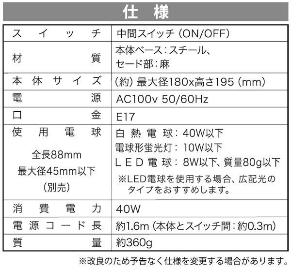 アバカ(麻)製セードから幻想的な光が広がり、オリエンタルな空間を演出します。 製造国:中国 付属品:保証書付取扱説明書(保証期間:1年間) ※サプライヤー直送品 ご注文後2~3営業日後の出荷となります【商品名】オーム電機 OHM テーブルスタンド ボール形タイプ TT-WN10CW