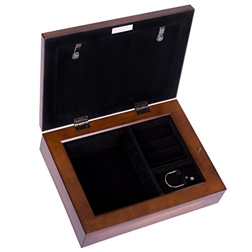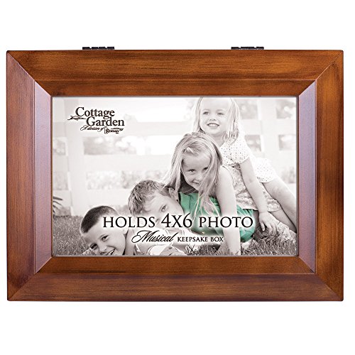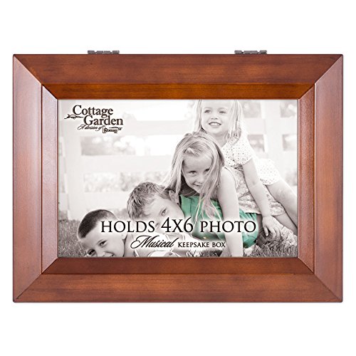 This is a beautifully designed music box by Cottage Garden Collections that features a rich walnut wood finish. It plays a high quality Sankyo music mechanism that can be seen on the inside of the box through protective glass. It plays the tune You Are My Sunshine. It has a 4x6 photo frame lid so the picture can be exchange for a personal photo. The feet are cushioned so they don't scratch surfaces. The box has a 4x4x1.5 inch cavity for storing jewelry and keepsakes. The inside is lined in nice black velvet. The hinges prevent the lid from falling all the way back and getting damaged when opened. This makes a beautiful gift for any age.Feature