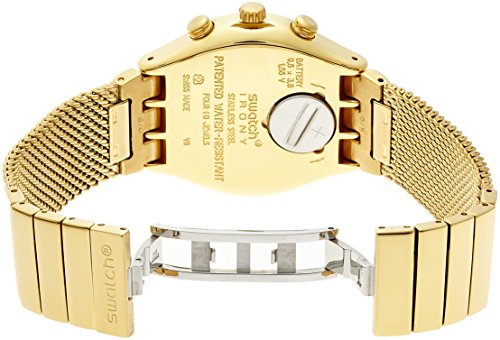 Gold-plated stainless steel case with a gold-plated stainless steel mesh bracelet. Fixed gold-plated bezel. Gold dial with gold-tone hands. No markers. Dial Type: Analog. Luminescent hands. Date display at the 4 o'clock position. Quartz movement. Scratch resistant plastic crystal. Solid case back. Case diameter: 43 mm. Case thickness: 13 mm. Round case shape. Band width: 20 mm. Butterfly clasp. Water resistant at 30 meters / 100 feet. Functions: date, hour, minute, second. Casual watch style. Swatch Chronograph Gold Dial Gold-plated Mesh Unisex Watch YCG410GA.Feature