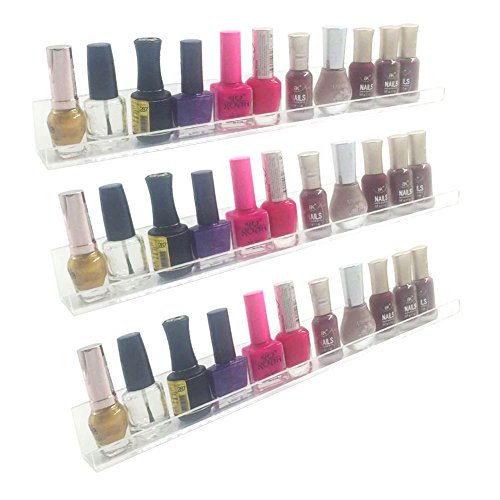 3 shelves hold up to 33-45 bottles of nail polish (actual number may vary based on size and shape of bottles)