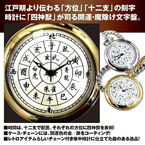 -. Feature : 大開運に導く「刻」表示!風水学に秘められし、古代から伝説と神憑り的な文字盤懐中時計 / 江戸期より伝わる「方位」「十二支」の刻字時計に「四神獣」が司る開運・魔除け文字盤 / 時間は、十二支で配置、それぞれの方位に四神獣を表刻 / ケース・チェーンには、開運色の金/銀をコーティング レトロアイテムらしいチェーン付き懐中時計に仕立てた趣のある逸品 / サイズ 約45×38×10mm  重さ:約47g チェーン長さ:38c材質:ブラス、ミネラルガラス