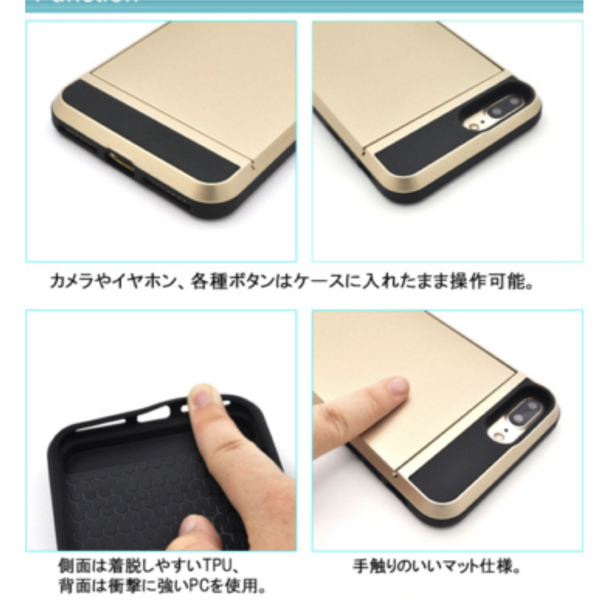 ICカード収納可能! 便利なスライド式カードホルダーがついた iケースです。 ICカードサイズのカードが一枚収納可能です。 ポイントカードや診察券の携帯に便利です。 着脱のしやすいTPUを側面に、 衝撃吸収性に優れたPCを背面に使用しており、 衝撃やキズなどからスマホを守ります。 カメラ、イヤホンや各種ボタンなどを ケースに入れたまま操作可能です。