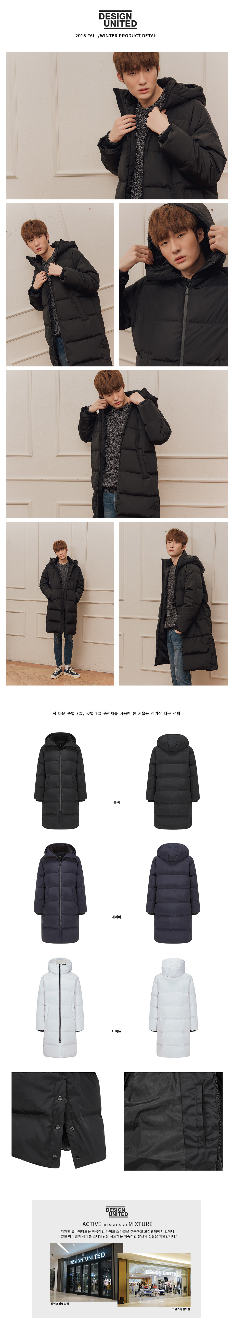 컬렉션 : 2018 Fall/Winter 디자인 포인트 : - 덕 다운 솜털 80%, 깃털 20% 충전재를 사용한 한 겨울용 긴기장 다운 점퍼- 사이드 히든 버튼 슬릿 포켓과 내부 원포켓 디테일이 있음- 리브소재의 이중 소매 포인트와 사이드 버튼 슬릿으로 멋을 준 디자인 스타일링 추천 : 겨울철 어디에나 무난하게 코디 가능한 캐주얼한 스타일링 연출 가능함