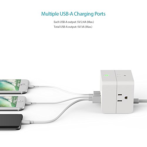 Specifications Material: ABS PC plastic LED indicator light color: Green Input: 100-240V~ 50/60Hz, 10A (Max.) Rated power: 1100W Rated surge energy: 400 joules Total USB-A output: DC 5V / 3A 15W (Max.) Each USB-A output: DC 5V / 2.4A (Max.) USB-C output (support PD charging): DC 20V / 1.5A, 15V / 2A, 12V / 2.5A, 9V / 3A, 5V / 3A 30W (Max.) Compatibility: For desktop computers, laptops, printers, TVs and more For iPhone / iPad / iPod, smartphones, tablets, power banks, speakers, headphones, GPS, Kindle Voyage and more For MacBook Pro / MacBook / Google Chromebook Pixel / Google Pixel / Google Pixel XL / Nexus 5X / 6P / Samsung Galaxy S8 / S8 / Microsoft Lumia 950 / 950 XL / Nokia N1 / LG G6 / G5 / LG V20 / HTC 10 / OnePlus 5 / 3T / 3 / 2 / Lenovo ZUK Z1 / Z2 Pro / Motorola moto z / Nintendo Switch and more USB-C powered devices Cord length: Approx. 4.92 ft / 59.06 in Cord diameter:Approx. 0.25 in / 6.35 mm Operating temperature: -40 ℃ ~ 70 ℃ Storage temperature: -10 ℃ ~ 42 ℃ Warranty: 12-month Certificate: FCC Item size: Approx. 2.95 * 2.44 * 2.61 in (L * W * H) Item weight: Approx. 12.58oz