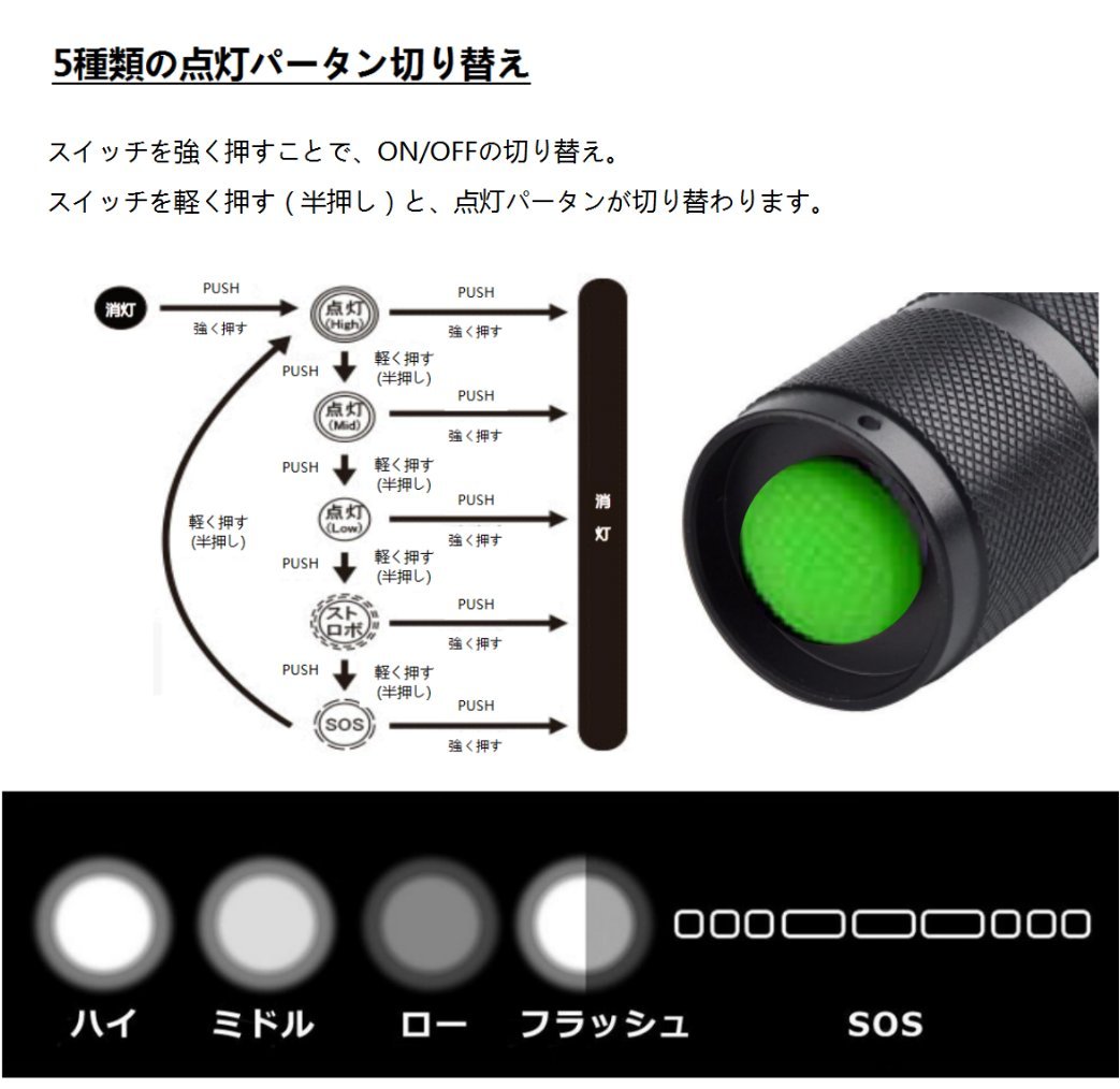 5 Mode: High / Middle / Low / Flashing / SOS