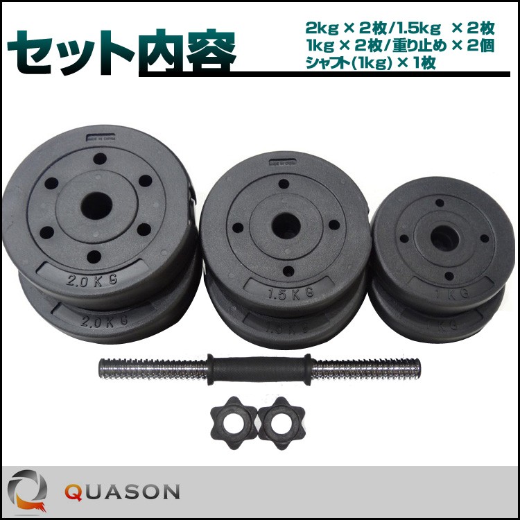 | セット内容 | 2kg → 2枚 1.5kg→ 2枚 1kg→ 2枚 シャフト(1kg) → 1本 重り止め → 2個 |