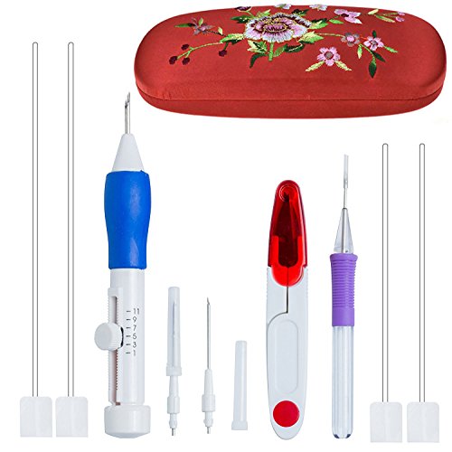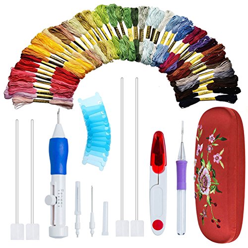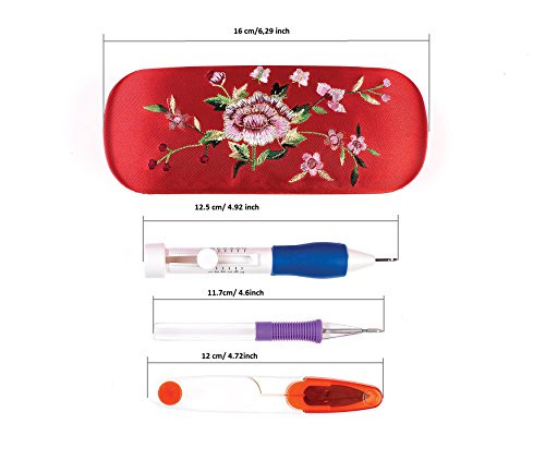 - ✅【EASY OPERATION】: Embroidery pen kit A great handiwork tool for beginners / 1pc x Embroidery Pen Handle/ 3pcs x Needles (Different Sizes)/4pcs x Threaders / 1pc x Extra Punch Needle / 1pc x Yarn scissor(Red Color) / 1pc x User Manual / 1pc x Red (Flower Embroidered)Storage Box, 50 Rainbow color Embroidery floss