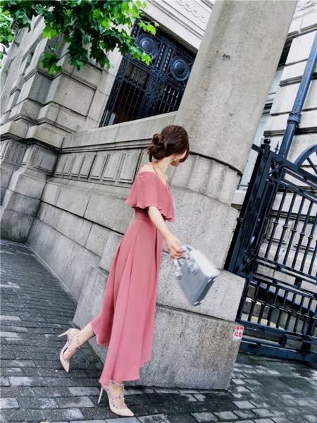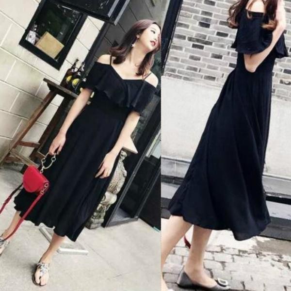 トレンド☆フリルオフショルダー ミモレ丈 シフォン ドレスワンピース