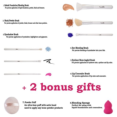 WE'VE THOUGHT OF EVERYTHING - Comes with luxury case to display and carry your high quality makeup brush set including: Synthetic Flat Top Kabuki Foundation/Blending/Contouring Brush, Eyeshadow Brush, Angled Liner/Brows Brush, Concealer/Lip Brush, Real Hair Wide Blush/Powder Brush and Eyeshadow Tapered Blending Brush, PLUS FREE Makeup Sponge and Velour Puff.