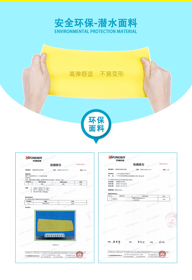 u0026nbsp; 潜水料Neoprene是由美国杜邦公司发明的高科技合成发泡橡胶材料,表面复合弹性布料后具有良好的伸缩性、弹性、优良的保温性能,手感舒适,外观精美。开始在国外是普遍用于制作高级潜水衣的材料所以大家通俗称为u0026amp;ldquo;潜水料u0026amp;rdquo;。这是一种非常好的材料,非常厚实,并且有一定弹性哟,手感非常柔和舒适。最重要的是非常非常健康,经过了欧盟SGS和美国FDA的严格检测,绝不含任何对人体有害的物质!