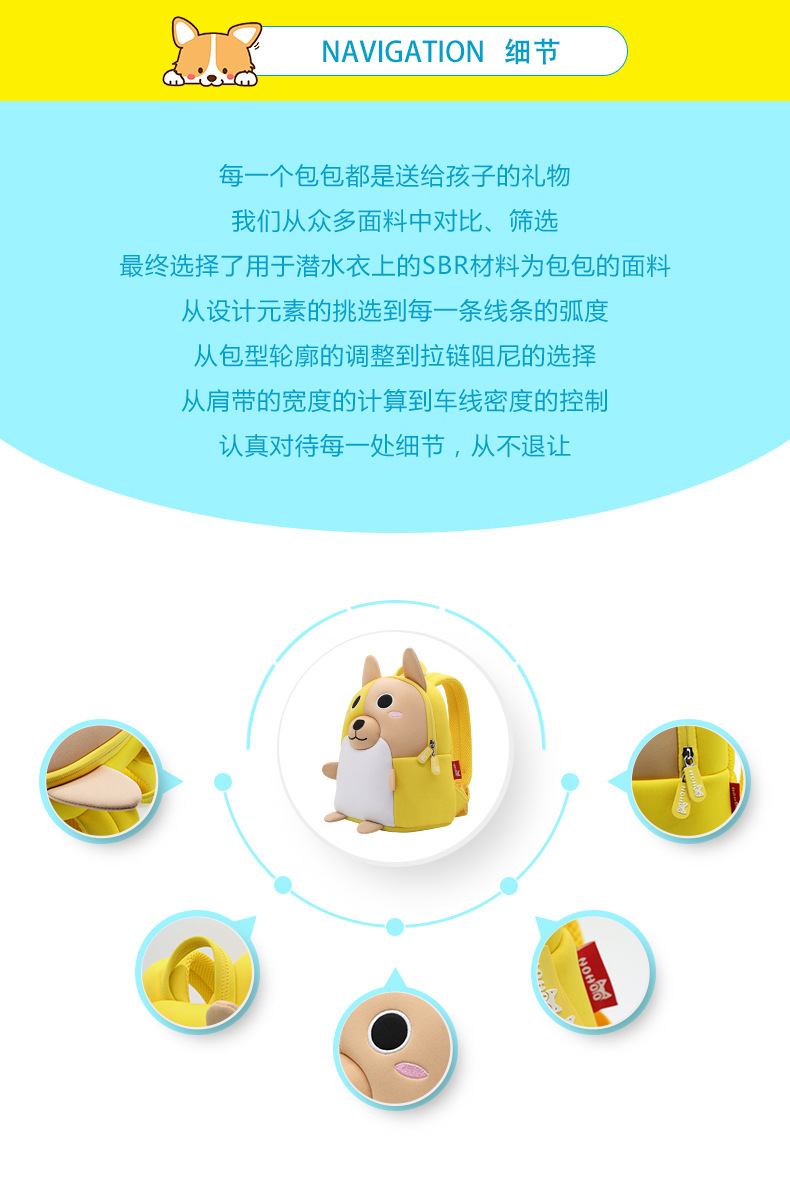 u0026nbsp;诺狐采用独特的Neoprene潜水料,有别于一般材质,潜水料具有良好的柔软性与弹性,防水防潮,质地轻盈等特点,有适用于专业潜水衣及各种运动领域,其立体塑形极具个性的特性更风靡时尚圈。诺狐童包独特的设计与良好的材质有别于一般的儿童包,立体结构剪裁,鲜艳大胆的配色,打材料的特性发挥到淋漓尽致,为我们的用户提供缤纷、舒适、健康的产品体验。