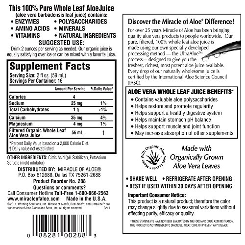 -. Binding : Health and Beauty -. Brand : Miracle of Aloe -. Feature : Premium-quality, IASC certified pure aloe vera juice / Specially filtered to remove components associated with diuretic effects / UltraAloe® Processed For Optimum Potency / Made From Organically Grown Aloe Plants & Cruelty Free / Helps restore regularity and promote digestive system -. IsAdultProduct : 0 -. Label : Miracle of Aloe -. Manufacturer : Miracle of Aloe -. MPN : MOA-Parent -. PackageQuantity : 1 -. PartNumber : MOA-Parent -. ProductGroup : Health and Beauty -. ProductTypeName : HEALTH_PERSONAL_CARE -. Publisher : Miracle of Aloe -. Studio : Miracle of Aloe -. Title : Real Aloe 100% Pure Aloe Juice - Made From Organically Grown Aloe Vera Leaves 100% Purified & Filtered