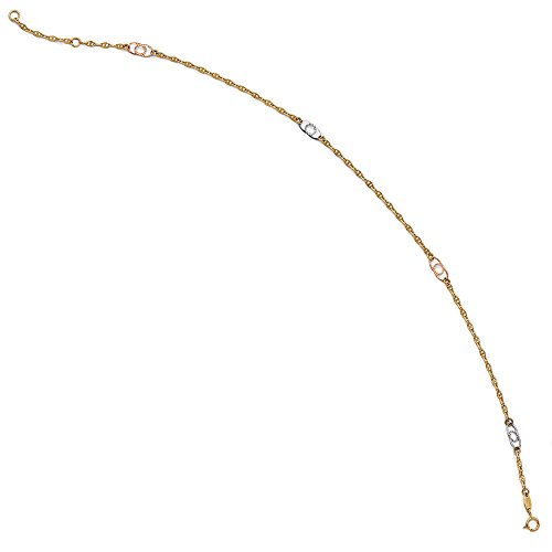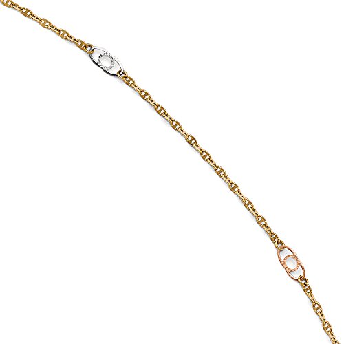 Indulge in a little bling for your leg with a shiny 14k tri-color gold anklet featuring a 2mm width anchor chain with four diamond-cut fancy anchor link stations. It is approximately 4mm in width, adjustable in length from 9.5 to 10.5 inches and closes with a spring ring clasp.Feature