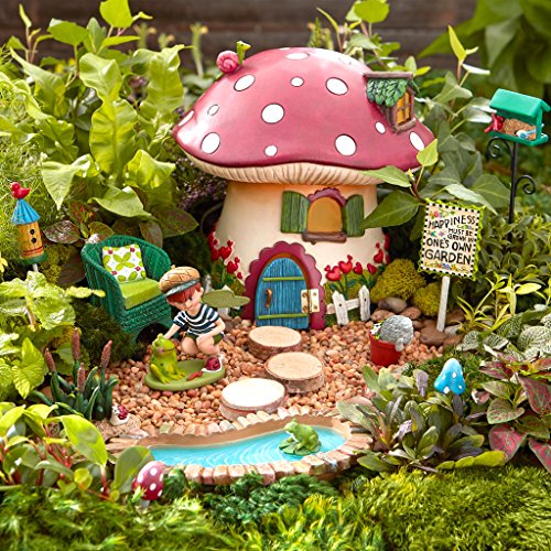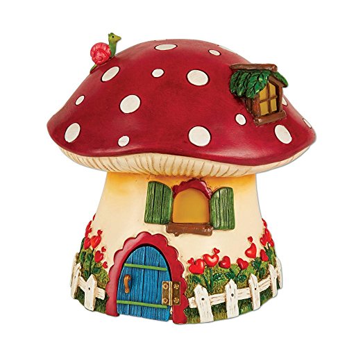 - From beloved artist Mary Engelbreit, miniature red mushroom cottage with solar lighting is ideal for fairy gardening; charges in the daylight, windows softly glow in the dark