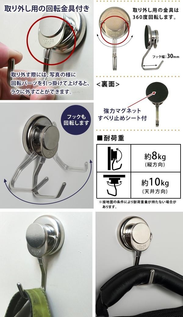| フックの幅が大きいので、持ち手の大きい鞄などもしっかりかけられます。また、強力磁石で固定する便利な壁掛けフックなので、机や冷蔵庫などに取り付けられてとっても便利!すべり止めシート付なので、スチールにもしっかり吸着します。 |
