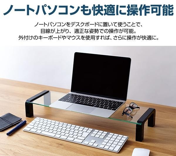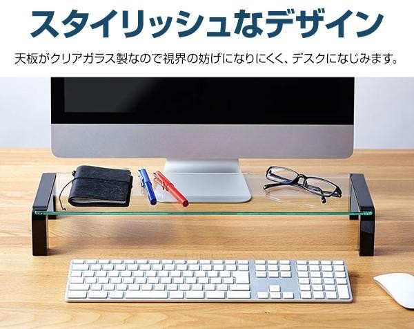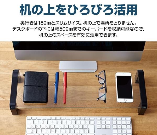| パソコンの液晶ディスプレイを上に置いて、キーボードをすっきり収納できるデスクボードです。奥行180mmのスリムサイズで、机の上で場所を取りません。ガラス製のボードは下に置いてあるものを認識でき、視界の妨げになりにくく、どんなデスクにもなじみます♪ |